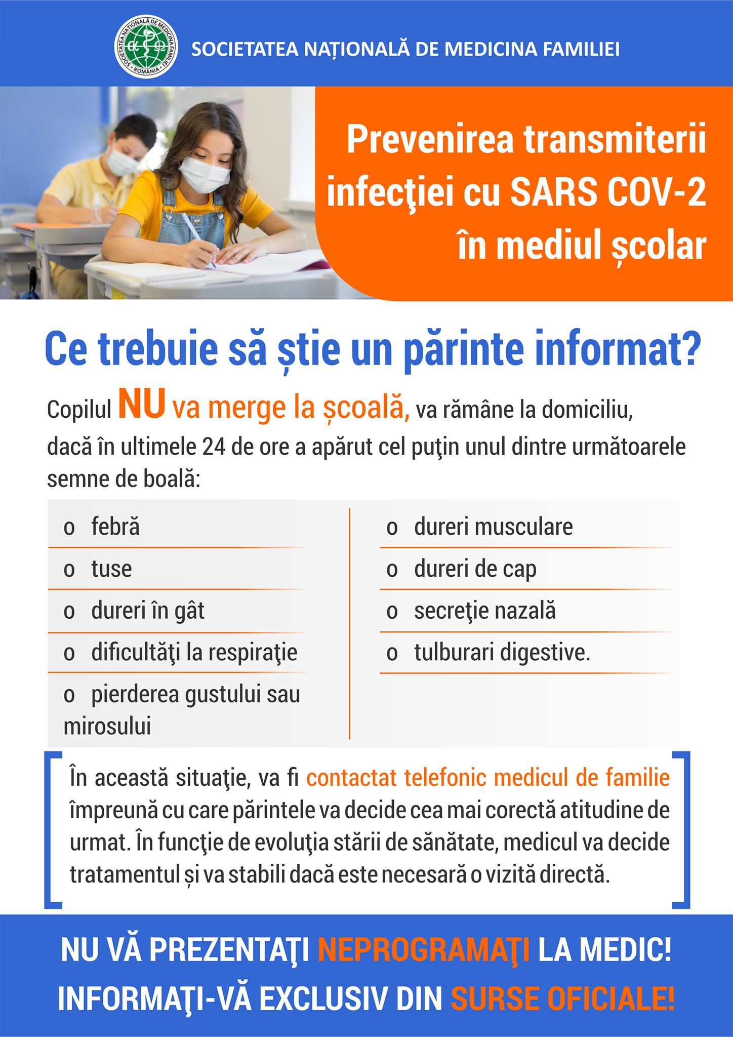 Afis informativ SNMF (Societatea Nationala de Medicina a Familiei) informatii pentru parinti privind limitarea raspandirii infectiei cu SARS Cov-2